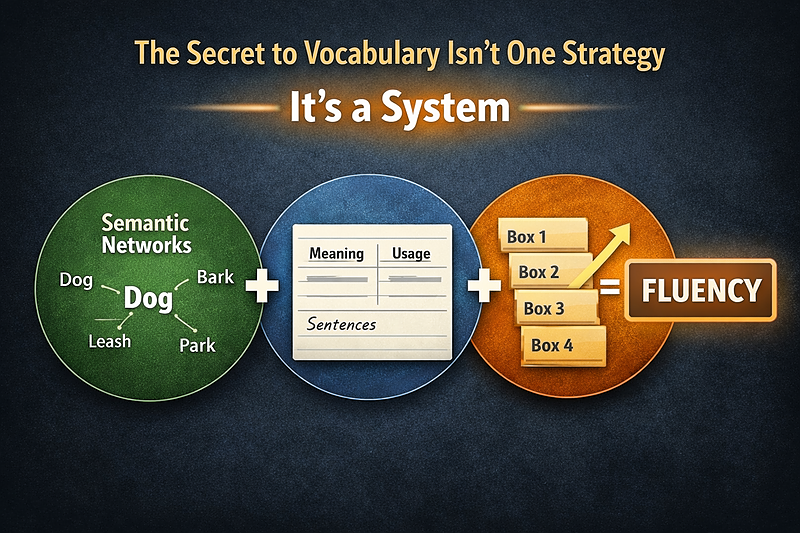 A simple visual showing that vocabulary learning works best as a system. Semantic networks help you understand words, Cornell notes organize them, and the Leitner system reinforces them through spaced repetition, turning vocabulary practice into long-term fluency.